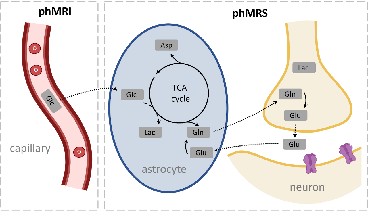 Our project aims to improve neuroimaging methods for studying how medications affect the brain. Current techniques, such as pharmacological MRI (phMRI), measure blood flow as an indirect marker of brain activity but can be affected by cardiovascular side effects of psychotropic drugs. To overcome this, we developed an interleaved MR protocol that combines phMRI with Magnetic Resonance Spectroscopy (MRS). MRS directly measures neurometabolites such as glutamate and GABA, the main neurotransmitters in the brain. By integrating these techniques, we can better understand how neuronal activity contributes to the phMRI signal. We tested this protocol in healthy volunteers using a double-dose, placebo-controlled randomized cross-over study with ketamine, a rapid-acting antidepressant that directly targets glutamate and GABA.